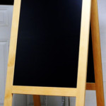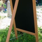 An A-Frame chalkboard has hinges and legs and stands on its own. We create 2 sided and single or easel style.